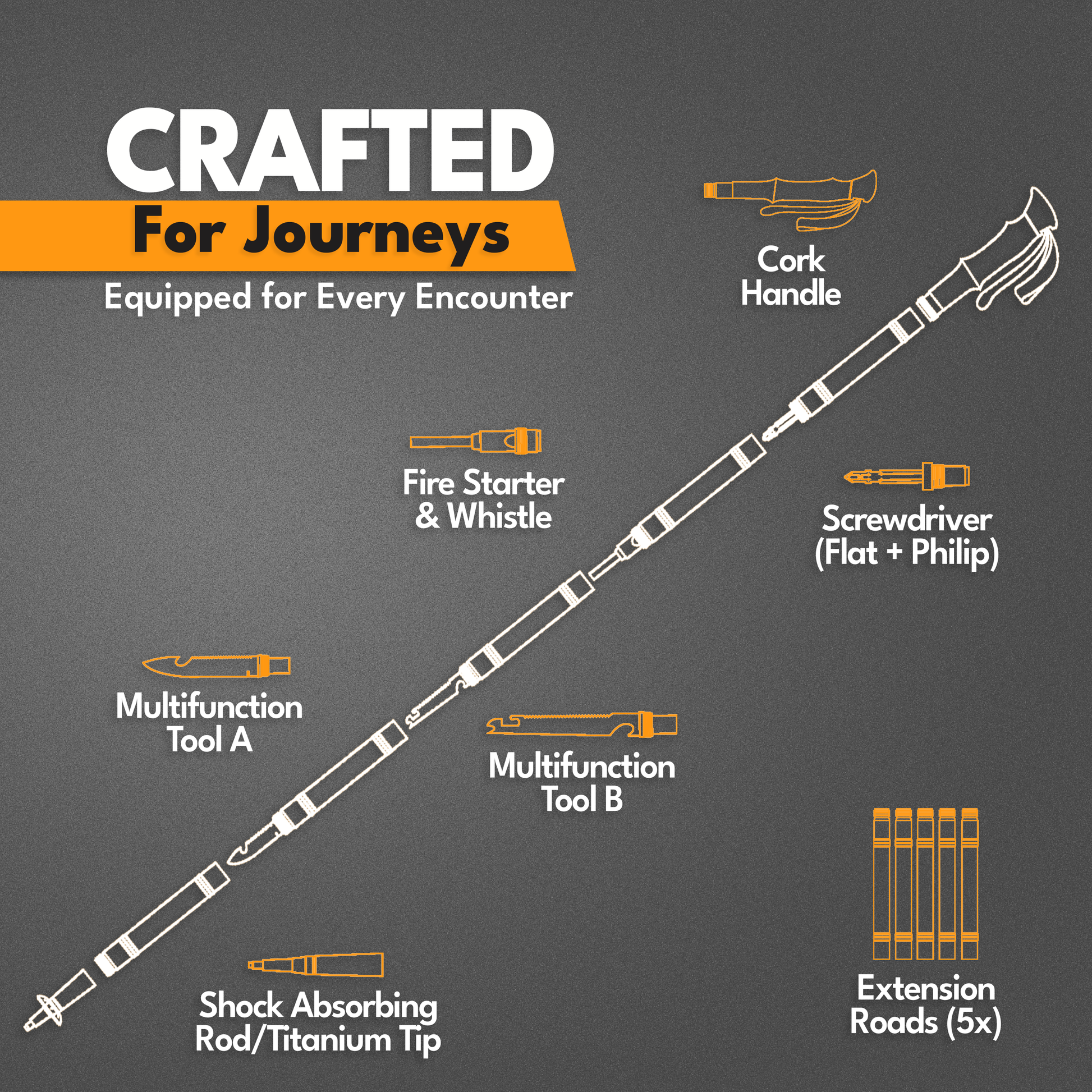 ✅ TrailGuard Stick – Tactical hiking staff with multi-tool attachments.